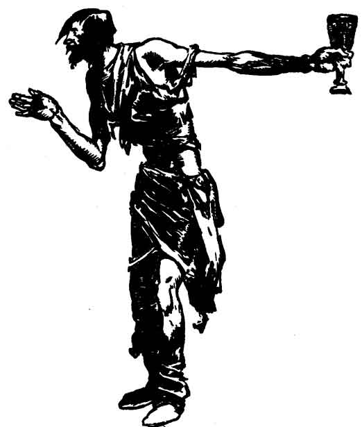 "My friends, you have heard this man's tale, and you see that he is no idle spinner of yarns who would obtain food and shelter on a bitter winter's night, for he has shown us this wondrous cup of gold and jewels. Surely there is no fairer goblet on earth, and this slave says that whence this came there is more and still more treasure. My comrades, eleven men I want, who will follow me to the foul dragon's lair. This grave menace must be destroyed before he wakens and finds that he has been discovered and plundered. Eleven of you, then, to my side. There will be deeds of bravery for all, and of treasure more than each man can dream."