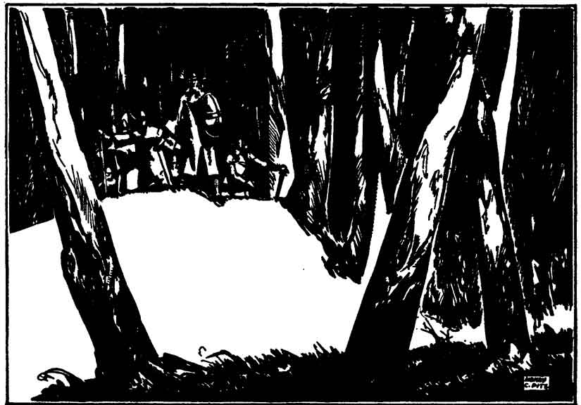 NIGHT was coming down when at last Beowulf and his eleven earls approached the dragon's barrow. It lay deep in a dark and gloomy forest, and the only light was the reflection of the dead day upon the ground-snow. The tall trees stood naked in their places, and all about hung a cold stillness which was broken only by the trampling of the adventurers upon the crunching snow.