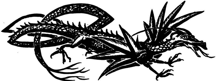 Over ten ells in length it measured, from the proud head to the poisoned tail-tip, and its vast body was covered with scales of brass as big as plates and thicker, each, than three fingers. Its forefeet were armed with six-inch claws of razor edge, and helped support a head so large and terrible that Beowulf marveled for a moment at the size. Its eyes were of green fire, its wide nostrils belched red flame and steam, and the immense jaws dripped livid ooze as they snapped in hideous savagery. So great was the issuing heat that Beowulf held up his shield, else he would have perished upon the spot.