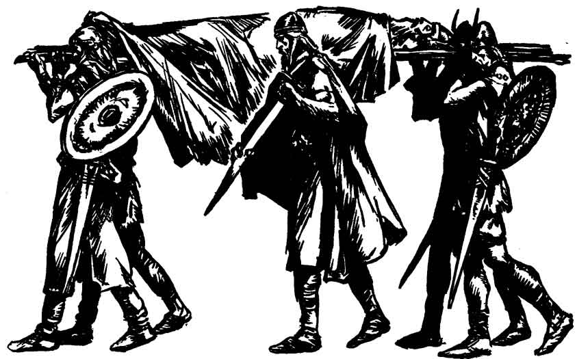 Higher and higher rose the flames and with them the lamentations of the people. And the noble earls took up again their sad marching about the burning pyre, and all night long they marched, until at long last there was nothing left of the pyre but a high mound of gray ashes in the gray dawn.