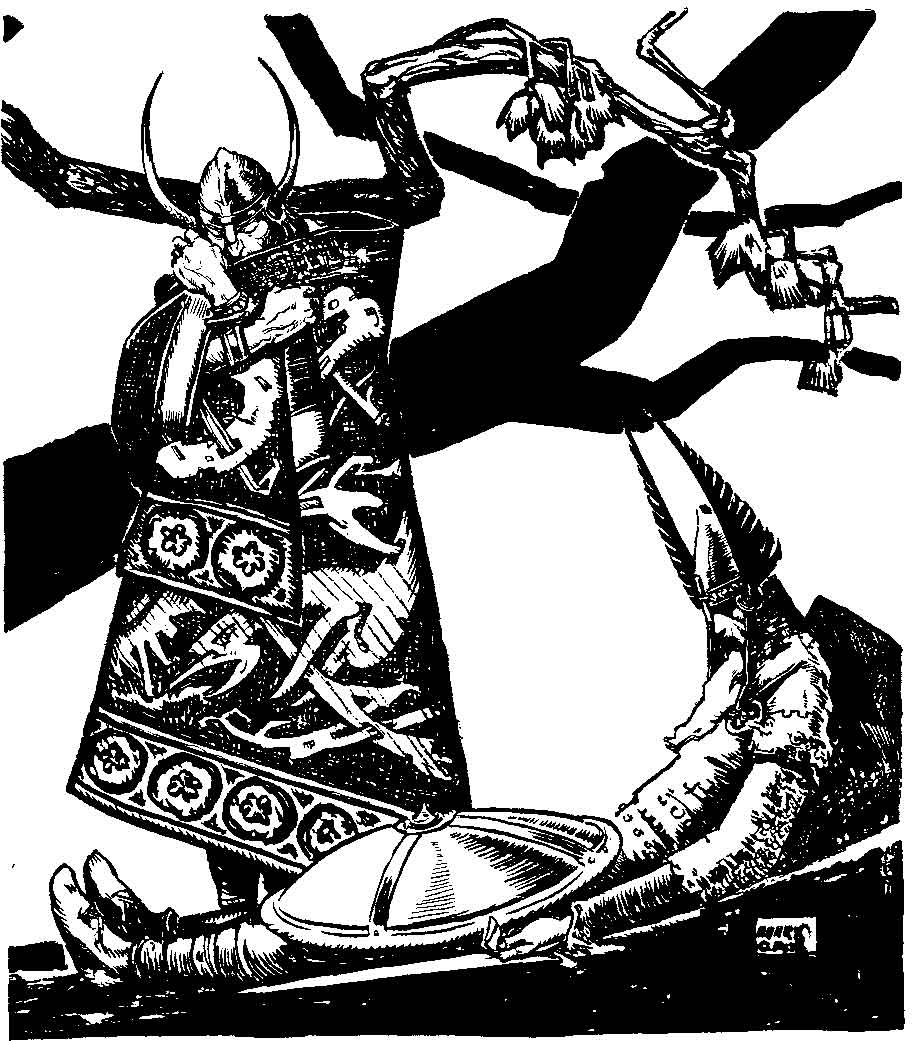 There arose a warm debate concerning how the dragon should be fought. Some thought they should attempt to slay him while he wrought destruction. Others, again, would lure him, if possible, to a high cliff, and force him into the boiling sea below. Yet others were in favor of letting him wreak his vengeance at will upon the country-side until such time should come when, sated in his lust for killing, he might fall into an exhausted sleep and become fair game for their sharp swords.