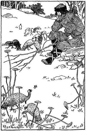 "All right," answered the Simpleton, and he went to the field and began to scare the sparrows. But as soon as the brothers left home, Ivanoushka started to the wide field and shouted out loud with a mighty voice: