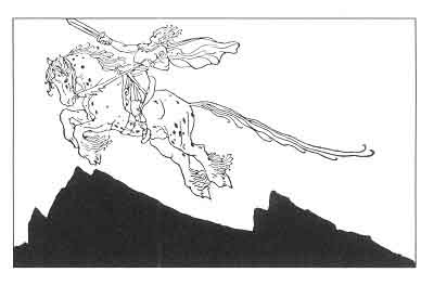 frighted the monstrous beasts. On and on Skirnir rode on his mighty horse. Then he came to a wall of fire. No other horse but his mighty horse could go through it. Skirnir rode through the fire and came to the dale in which was Gymer's dwelling.