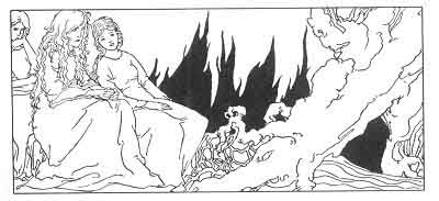 They told him only of shadows and forebodings. Odin All-Father did not speak to the Dwellers in Asgard of the things they told him. But Frigga, his Queen, saw in his eyes the shadows and forebodings of things to come. And when he spoke to her about these things she said, "Do not strive against what must take place. Let us go to the holy Norns who sit by Urda's Well and see if the shadows and the forebodings will remain when you have looked into their eyes."