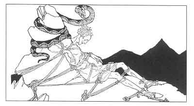 He was in the hands of those whose wrath was strong against him. They brought him to a cavern and they bound him to three sharp-pointed rocks. With cords that were made of the sinews of wolves they bound him, and they transformed the cords into iron bands. There they would have left Loki bound and helpless. But Skadi, with her fierce Giant blood, was not content that he should be left untormented. She found a serpent that had deadly venom and she hung this serpent above Loki's head. The drops of venom fell upon him, bringing him anguish drop by drop, minute by minute. So Loki's torture went on.