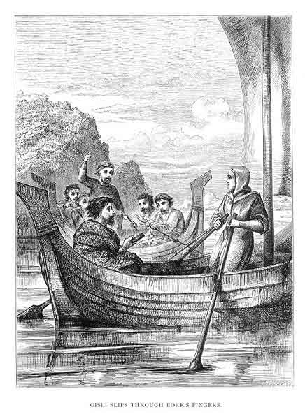 Then they jump into their boat and row after them, and ply the oars fast. They soon see that Gisli and the maid with a fair tide have got a good way across the sound, and each boat rowed smartly. But that boat goes faster through the water which has most men to pull, and they overhauled them so much that Bork and his men were just a spear's throw behind them when they got to land.