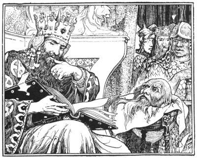 "Turn over a few more pages," answered the head. The king went on turning, still putting his finger in his mouth, till the poison in which each page was dipped took effect. His sight failed him, and he fell at the foot of his throne.