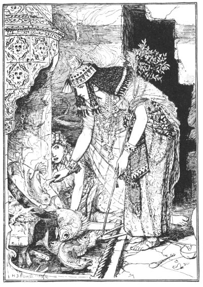 But now we must return to the kitchen, which we shall find in great confusion. The cook, when she had cleaned the fish, put them in a pan with some oil to fry them. When she thought them cooked enough on one side she turned them on the other. But scarcely had she done so when the walls of the kitchen opened, and there came out a young and beautiful damsel. She was dressed in an Egyptian dress of flowered satin, and she wore earrings, and a necklace of white pearls, and bracelets of gold set with rubies, and she held a wand of myrtle in her hand.