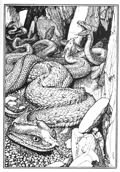 The valley in which I found myself was deep and narrow, and surrounded by mountains which towered into the clouds, and were so steep and rocky that there was no way of climbing up their sides. As I wandered about, seeking anxiously for some means of escaping from this trap, I observed that the ground was strewed with diamonds, some of them of an astonishing size. This sight gave me great pleasure, but my delight was speedily damped when I saw also numbers of horrible snakes so long and so large that the smallest of them could have swallowed an elephant with ease. Fortunately for me they seemed to hide in caverns of the rocks by day, and only came out by night, probably because of their enemy the roc.