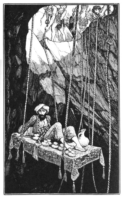 descending into the gloomy pit, with my seven loaves and pitcher of water beside me. Almost before I reached the bottom the stone was rolled into its place above my head, and I was left to my fate. A feeble ray of light shone into the cavern through some chink, and when I had the courage to look about me I could see that I was in a vast vault, bestrewn with bones and bodies of the dead. I even fancied that I heard the expiring sighs of those who, like myself, had come into this dismal place alive. All in vain did I shriek aloud with rage and despair, reproaching myself for the love of gain and adventure which had brought me to such a pass, but at length, growing calmer, I took up my bread and water, and wrapping my face in my mantle I groped my way towards the end of the cavern, where the air was fresher.