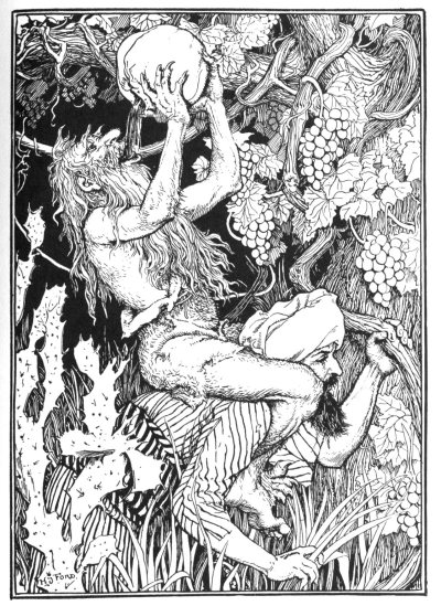 The old monster was not slow to perceive the effect which my draught had produced and that I carried him more lightly than usual, so he stretched out his skinny hand and seizing the gourd first tasted its contents cautiously, then drained them to the very last drop. The wine was strong and the gourd capacious, so he also began to sing after a fashion, and soon I had the delight of feeling the iron grip of his goblin legs unclasp, and with one vigorous effort I threw him to the ground, from which he never moved again. I was so rejoiced to have at last got rid of this uncanny old man that I ran leaping and bounding down to the sea shore, where, by the greatest good luck, I met with some mariners who had anchored off the island to enjoy the delicious fruits, and to renew their supply of water.