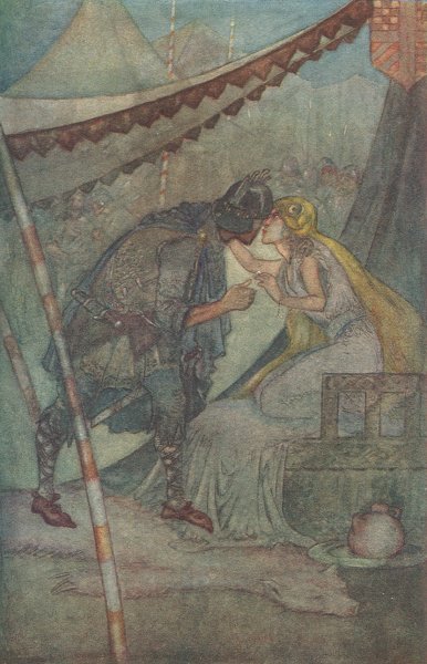 "'Sir King Baldwin, for God's sake, speak! I am your love, mistake me not. If I have offended you in aught, it shall be made amends for wholly to your pleasure; but speak to me. For you was my body baptized and lifted; my heart leans on you, and all my affections, and if you fail me, it will be ill done. Too soon it seems to me, if already you repent. Baldwin, is it a trick? Are you deceiving me? Speak to me, friend, if you can. . . . I see your garments dyed and bloody, but I do not believe that you are killed; there is no man so bold or so outrageous who ever could kill you; he durst not do so. But I think by such a will you wish to try me, how I should behave if you were departed. Speak to me, for God's sake who was born of virgin, and for that lady who kept chastity, and for the holy cross whereon Jesus suffered! Try me no more, friend, it is enough; I shall die now if you tarry longer,' 'Naymes,' says the king, 'take this lady away; if I see her grief any more, I shall go mad.'