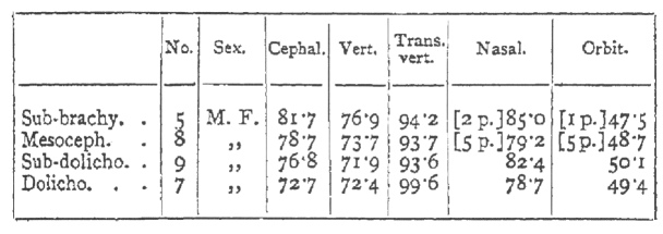 Out of the 29 crania of the upper series only 5 were sub-brachycephalous. Taking both sexes together—in Table IV. they are given separately—the indices were:—