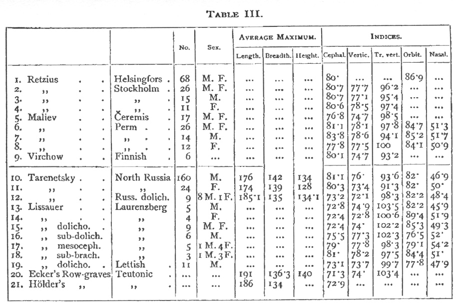[paragraph continues] They were measured by Dr. Weinberg, and were taken from burial-places dating from the tenth to the twelfth century. 1 As he has calculated the vertical and trans-vertical indices from the maximum height of Virchow, I have added two columns in which the bregma height is used, and enclosed the figures in square brackets.