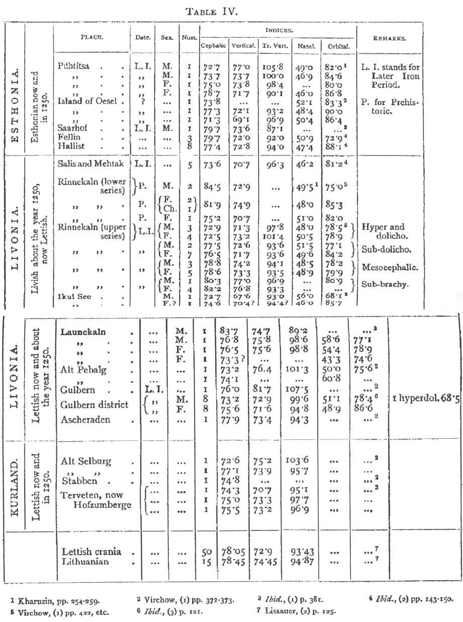 In Table IV. are brought together the indices of 91 crania; 87 of them measured by Professor Virchow, 4 by Dr, Kharuzin, who uses Broca's method, and all arranged in geographical order from north to south. Though no age is assigned to several of these crania, the presumption is that none of them belong to a very remote age, for, on the whole, before the introduction of Christianity cremation prevailed. Hence it is more than probable that they belong to a time when the population was the same as in the thirteenth century. The only certain prehistoric crania are those of the lower series, found in excavating the Rinnekaln in Livland, while the upper series from the same mound can only be from three hundred to four hundred years old.