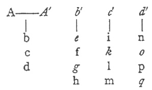 Here A A´ represents a man and wife with their three sons b, c, d. In course of time their wives b´, c´, d´, bear families, shown in three columns to the right and lettered from e—q, the italics marking the girls. It is possible, and we therefore suppose that niece e is older than her uncle d; that i is older than his first cousin h, and that n is older than his first cousins h, m. Then with regard to d, we see that b, c are his elder brothers (iz´a), his niece e is his elder sister (aka), and his remaining nephews and nieces from f—g are younger brothers (šolö) and younger sisters (šušar). With regard to h his two uncles c, d, and his fast cousins i, n are his elder brothers, his full sisters e, g are his elder sisters, and his first cousins k, o, q are his younger sisters. In conversation b´ would be addressed as engai´, and c´, d´ as šeške. As there is no native term for grandson in the Finnish groups, the father must have called his grandsons 'sons,' but all the grandchildren from e—g