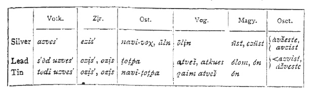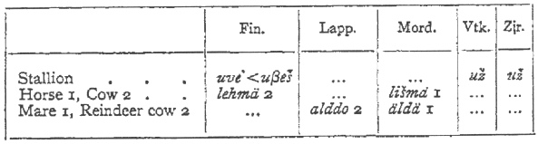 [paragraph continues] Though F. jumala now means 'god,' the corresponding word in Čeremis also means 'sky,' and the Mordvin for 'lightning,' jondol, stands for jom-dol, 'the fire of jom,' 2 On the other hand, the F. ilma, 'air,' corresponds with the Permian words for 'air,' 'sky,' 'god,' and the proper name Ilmari, L. Ilmaris, who is sometimes substituted for the native wind-god, is formally the equivalent of V. inmar, 'sky,' 'god.' It can hardly be doubted that sky is the older meaning, though it may always have been associated with the idea of 'sky-spirit,' and that 'god' is secondary. It would be interesting to know at what stage in the history