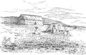 These houses are usually about 25 feet long and 15 feet wide with undressed weather-boards and rooted with the same material. Hinged doors open in the center and admit light and ventilation, though a few of the more pretentious buildings are furnished with small glazed windows. The floors are of bare earth strewn with a litter of dried grass, filthy and vermin-infested from long use. Mats made of bulrushes are spread out for sleeping; several rough bedsteads and chests were seen, but the majority of the houses are destitute of furniture or ornament. Several families occupy the same dwelling, men, women, and children lie down together like dogs in a kennel, and with about the same ideas of what constitutes the comforts of life.