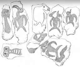 much time is possible was devoted to examining and sketching these curious relies. The hard volcanic rock is covered by carvings intended to represent human faces, birds, fishes, and mythical animals, all very much defaced by the ravages of time and the elements (Plate XXIII). The apparent age of some of the rock-carvings antedates the neighboring stone houses, the images, and other relics of the island except the ruined village on the bluff west of Kotatake Mountain. Fishes and turtles appear frequently among these sculptures, but the most common figure is a mythical animal, half human in form, with bowed back and long claw-like legs and arms. According to the natives. this symbol was