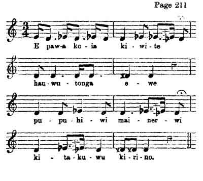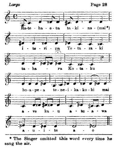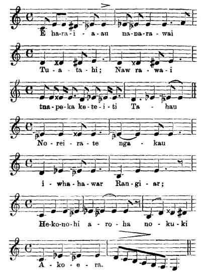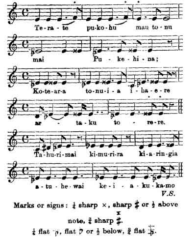 My point is, to prove that the ancients did possess and practise a modulation which contained much less intervals than ours, and that such, or an approach to such, modulation (though probably but imperfect) is still retained among some people, and that the principles on which the Greeks founded their enharmonic genus, still survive in natural song, though I will not be bold enough to assert that sometimes these songs may not change into one of the chromatic Χρόαι {Greek Xróai}, which, for want of practice, I might not be able to decide. One thing, however, is certain, that, as Aristoxenus tells us, no perfect ear could modulate more than two dieses at a time (and then there was a 'saltus' or interval of two tones), and as the New Zealand songs frequently exhibit more than two close intervals together, it is more than probable that many of these songs are a chromatic, represented by 120, 114 or 108, or 120, 112½, 108; but it will not be worth while for the present purpose to discuss this nicety, as all we want is a practical approximation.