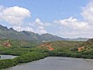 Finally, one day, the promised sign appeared. The snow white speck of cloud, no bigger than a man's hand, arose over the mountains of Lanai and made its way across the stormy channel in the face of the opposing gale, increasing as it came, until it settled in a majestic mass on the mountains at the head of Mapulehu Valley. Then appeared a splendid rainbow, proudly over-arching the valley, its ends resting on the high lands on either side. The wind began to blow; the rain began to pour, and shortly a furious storm came down the doomed valley, filling its bed from side to side with a mad rushing torrent, which, sweeping everything before it, spread out upon the belt of lowlands at the mouth of the valley, overwhelming Kupa and all his people in one common ruin, and washing them all into the sea, where they were devoured by the sharks. All were destroyed except Kamalo and his family, who were safe within their sacred inclosure, which the flood dared not touch, though it spread terror and ruin on every side of them. Wherefore the harbor of Pukoo, where this terrible event occurred, was long known as Ai Kanaka (man eater), and it has passed into a proverb among the inhabitants of