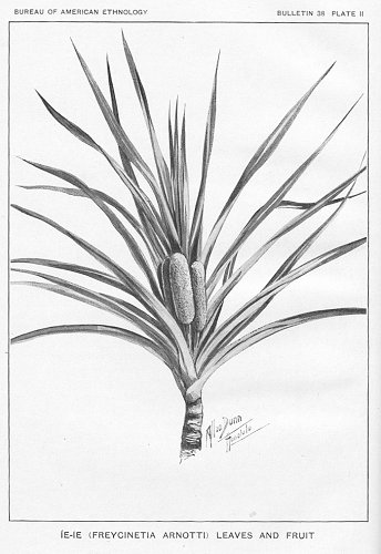 Among decorations approved and most highly esteemed stood preeminent the fragrant maile (pl. IV) and the star-like fronds and ruddy drupe of the íe-íe (pl. II) and its kindred, the hála-pépe (pl. III); the scarlet pompons of the lehúa (pl. XIII) and ohi’a, with the fruit of the latter (the mountain-apple); many varieties of fern, including that splendid parasite, the "bird's nest fern" (ekáha), hailed by