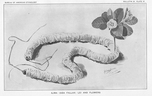 After the ceremony of the pa-ú came that of the lei, a wreath to crown the head and another for the neck and shoulders. It was not the custom in the old times to overwhelm the body with floral decorations and to blur the outlines of the figure to the point of disfigurement; nor was every flower that blows acceptable as an offering. The gods were jealous and nice in their tastes, pleased only with flowers indigenous to the soil--the ilima (pl. VI), the lehua, the maile, the ie-ie, and the like (see pp. 19, 20). The ceremony was quickly accomplished. As the company knotted the garlands about head or neck, they sang: