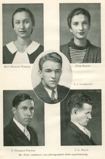 Click to enlargeFrontispiece: MAY FRANCES TURNER JUNE BAILEY A. J. LINZMAYER T. COLEMAN COOPER J. G. PRATT Mr. Pratt (assistant) was photographed while experimenting.