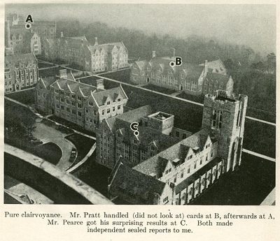 Pure clairvoyance. Mr. Pratt handled (did not look at) cards at B, afterwards at A, Mr. Pearce got his surprising results at C. Both made independent sealed reports to me.