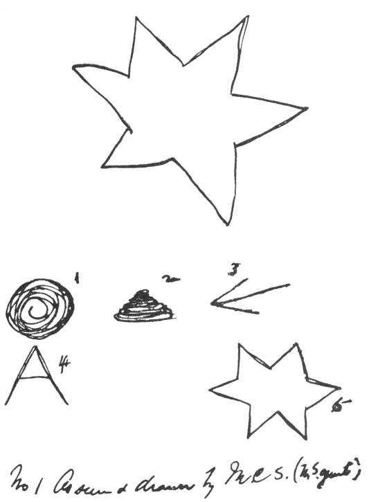 before starting to concentrate, she had been looking at her drawing of many concentric circles, which she had made in a test with Bob the previous day (fig. 19a). So her first vision was of a whirl of circles. This turned sideways, and then took the shape of an arrowhead, and then of a letter A, and finally evolved into a complete star. As the agent in this test, I wish to repeat that I made my drawing in my study with the door closed, that I kept it before my eyes the entire time, and that the door stayed closed until Craig called that she was through.
