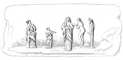 IN this bas-relief is represented one of the most disgraceful ceremonies of Paganism. Several women are conducting a young girl, whom we may suppose to be newly married, to a Statue of Priapus, and the unfortunate creature is already on the point of making to the marble figure the painful sacrifice of her virginity. She alone, of all the troop, is entirely naked; she bends her head with a confused and sad air, and leans on the shoulder of an aged woman, possibly her mother. Not far off a little girl plays on the double flute to stifle the cries of pain extorted from the victim; farther off an old woman, resting on one knee, looks upon the scene, and appears to grow impatient at the hesitation manifested by the young wife.