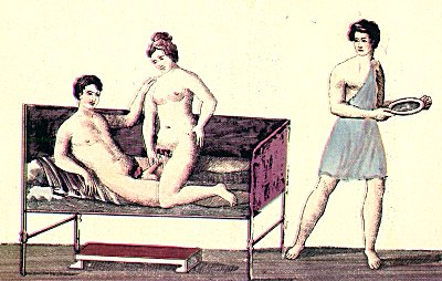 THIS painting is almost a repetition of the preceding one. A young girl, seated astride over her lover, is again playing the chief part. The cubicular slave, on the point of withdrawing from the mysterious chamber, turns round and casts a lascivious look on the two lovers. He bears a dish, upon which nothing is seen, and which probably contained the aphrodisiac aliments of which the two actors have made use.