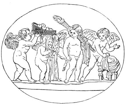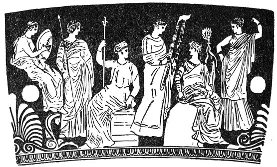 grapes, dates, and pomegranates, for Dionysos was the god of generation, the harbinger of spring, and the bearer of fruit for all mankind. Next were the musicians, playing tunes upon flute and cymbal.