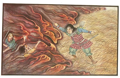 Yamato-dake did just as they had expected. He came quietly on, suspecting nothing. Suddenly the rushes took fire in front and at the sides of him. The Prince realised that he had been betrayed. The treacherous guide 'had disappeared. The Prince stood in danger of suffocation and death. The smoke, dense and choking, rushed along with rapidity and great roaring.