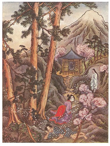 One day, about 1107 A.D., the girl was praying for her mother's recovery from sickness. Okureha was her name. She lived at Tashiro, at the foot of the mountain, and was the beauty of the countryside,—the daughter of a much-loved samurai of some importance. Amid the solemn silence Okureha clapped her hands thrice before Kwannon as she prayed, causing mountain echoes to resound. Having finished her prayers, Okureha began to make her
