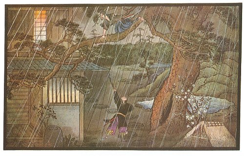 The inn was surrounded by hedges, and several clumps of bamboos stood in the corners. At the far end was an artificial mountain with a lake at its foot, and near the lake a little summer-house over which towered a huge and ancient pine tree, one of the branches of which stretched right back over the roof of the inn. At about one o'clock