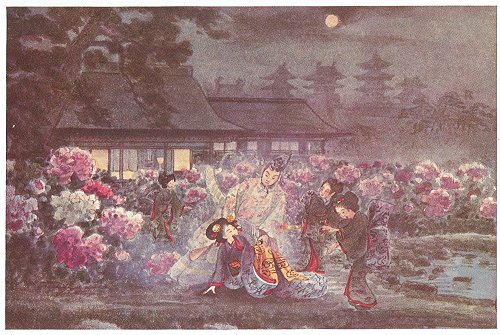 That evening the poor Princess was more wearily unhappy than ever before. Thinking to enliven her a little, the maids sent for a celebrated player on the biwa, called Yashaskita Kengyo. The weather being hot, they were sitting on the gallery (engawa); and while the musician was playing 'Dannoura' there appeared suddenly from behind the peonies the same handsome young samurai. He was visible to all this time—even to the peonies embroidered on his dress.