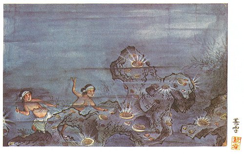 The priest and the elder fishermen considered matters, and came to the conclusion that what they had seen was indeed their goddess, and that she had been pleased at their ceremony. Also, they thought the dead body must still be at the bottom of the bay, directly under the spot whence the flashes of light and the goddess herself had appeared. It was arranged that two young virgins who could dive should be sent down at the spot to see, and two were accordingly chosen—Saotome and Tamajo. Wrapped in white skirts, these maidens were taken in a boat to where the flashes and the goddess had appeared. The girls dived, reached the bottom, and searched for the body of the man drowned two years before. Instead of finding it, they saw only a small but dazzling light. Curiosity led them to the spot, and there they found