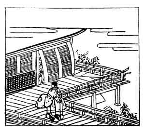 Mi wo tsukushite mo means 'even though I die in the attempt', but miotsukushi is a graduated stick, set up to measure the rise and fall of the tide; and Naniwa, the modern seaport of Osaka, seems to have been inserted chiefly as the place where this tide-gauge was set up. The poet may have meant, that the river of his tears was so deep as to require a gauge to measure it; or, as Professor MacCauley reads it, he was hinting, that if he could not attain his ends his body would be found at the tide-gauge in Naniwa Bay. The picture seems to show the poet on the verandah and his lady-love looking through the screen.