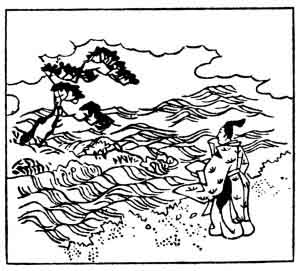 Moto-suke lived towards the close of the tenth century, and was the son of the writer of verse No. 36. The idea of one's sleeves being wet with tears is a common one in Japanese poetry. Matsu-yama, or Pine-tree Hill, is in Northern Japan, on the boundaries between the Provinces of Rikuchū and Nambu. In the illustration the hill with the pine tree on the top appears to be just sinking beneath the waves.