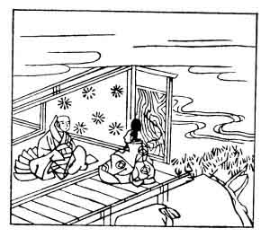 The writer lived early in the twelfth century, when the Court was given over to intrigue. Tadamichi Fujiwara, the Regent, had promised him a post of honour for his son, but had, year after year, failed to fulfil it. The verse is a gentle reminder, and the last couplet, which does not appear in the translation, delicately hints that the autumn of the present year also is slipping away. In the illustration we see Mototoshi addressing his petition to the Regent.
