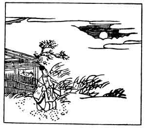 Aki-suke died about the year 1155. More-izuru literally means, that the light of the moon 'leaks out'; the verse is a charming example of a Japanese picture-poem. Probably the first word of the verse was purposely made to coincide with the poet's first name in sound, although the two words are written with different characters in the original.