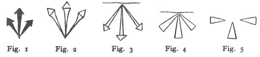 [paragraph continues] These are the Three Nails of the Passion. In figs. 1 and 2 they are unmistakably so, with the points downwards. Figs. 3 and 4 have the significant horizontal mark which, in the first centuries of Christianity, stood for the Second (with feminine meanings) Person of the Trinity; but the points of the spikes (spicæ, or thorns) are gathered upwards in the centre. In fig. 5 there are still the three nails; but a suggestive similarity to be 'remarked in this figure is a disposition resembling the crux-ansata--an incessant symbol, always reappearing in Egyptian sculptures and hieroglyphics. There is also a likeness to the mysterious letter 'Tau'. The whole first chapter of Genesis is' said to be contained in this latter-emblem--this magnificent, all-including 'Tau'.