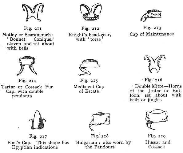 Fig. 203: Phrygian Cap (Male); Fig. 204: Phrygian Cap; Fig. 205: Peak, pic, or cock ('cocked'); Fig. 206: Phrygian Cap (Classic Shepherds); Fig. 207: Pallas-Athene; Fig. 208: Athene (Minerva); Fig. 209: Jitra, Persia; Fig. 210: Persia |