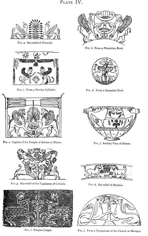 Finally, it crossed the Alps with Roman art. M. de Caumont was one of the first to draw attention to its presence amongst the sculptures of the Roman period, in particular on a tympanum of the church at Marigny, in the Calvados department. It is here sculptured between two lions, which hold the stem with their fore-paws, and bite at the extremities of the middle branches (pl. iv., fig. j). 2