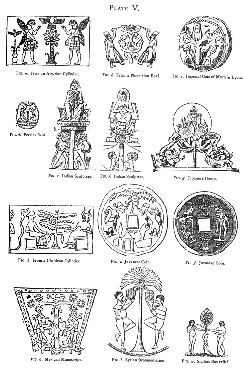 Each nation seems, indeed, to have introduced into this symbolical combination the tree which it deemed the most valuable. Thus we see depicted in turn the date-palm in Chaldæa, the vine or a cone-bearing plant in Assyria, the lotus in Phœnicia, and the fig-tree in India. 1