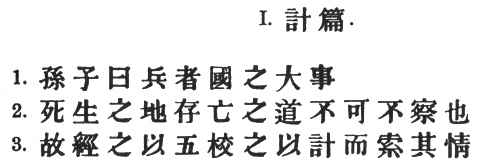 1:2 The old text of the T‘ung Tien has #, etc. Later editors have inserted # after #, and # before #. The former correction is perhaps superfluous, but the latter seems necessary in order to make sense, and is supported by the accepted reading in § 12, where the same words recur. I am inclined to think, however, that the whole sentence from # to # is an interpolation and has no business here at all. If it be retained, Wang Hsi must be right in saying that # denotes the "seven considerations" in § 13. # are the circumstances or conditions likely to bring about victory or defeat. The antecedent of the first # is #; of the second, #. # p. 3 contains the idea of "comparison with the enemy," which cannot well be brought out here, but will appear in § 12. Altogether, difficult though it is, the passage is not so hopelessly corrupt as to justify Capt. Calthrop in burking it entirely.
