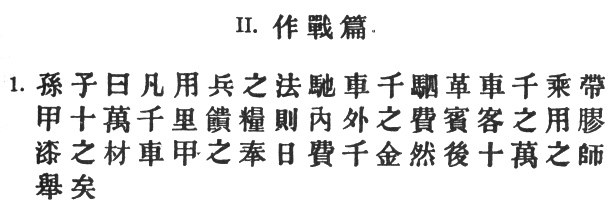 9:1 Ts‘ao Kung has the note: # "He who wishes to fight must first count the cost," which prepares us for the discovery that the subject of the chapter is not what we might expect from the title, but is primarily a consideration of ways and means.