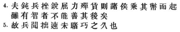 11:2 This concise and difficult sentence is not well explained by any of the commentators. Ts‘ao Kung, Li Ch‘üan, Mêng Shih, Tu Yu, Tu Mu and Mei Yao-ch‘ên have notes to the effect that a general, though naturally stupid, may nevertheless conquer through sheer force of rapidity. Ho Shih says: "Haste may be stupid, but at any rate it saves expenditure of energy and treasure; protracted operations may be very clever, but they bring calamity in their train." Wang Hsi evades the difficulty by remarking: "Lengthy operations mean an army growing old, wealth being expended, an empty exchequer and distress among the people; true cleverness insures against the occurrence of such calamities." Chang Yü says: "So long as victory can be attained, stupid haste is preferable to clever dilatoriness." Now Sun Tzŭ says nothing whatever, except possibly by implication, about ill-considered haste being better than ingenious but lengthy operations. What he does say is something much more guarded, namely that, while speed may sometimes be injudicious, tardiness can never be anything but foolish—if only because it means impoverishment to the nation. Capt. Calthrop indulges his imagination with the following: "Therefore it is acknowledged that war cannot be too short in duration. But though conducted with the utmost art, if long continuing, misfortunes do always appear." It is hardly worth while to note the total disappearance of # in this precious concoction. In considering the point raised here by Sun Tzŭ, the classic example of Fabius Cunctator will inevitably occur td the mind. That general deliberately measured the endurance of Rome against that of Hannibal's isolated army, because it seemed to him that the latter was more likely to suffer from a long campaign in a strange country. But it is quite a moot question whether his tactics would have proved successful in the long run. Their reversal it is true, led to Cannae; but this only establishes a negative presumption in their favour.