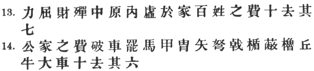 14:1 The Yü Lan omits #. I would propose the emended reading #, etc. In view of the fact that we have # in the two preceding paragraphs, it seems probable that # is a scribe's mistake for #, having been added afterwards to make sense. #, literally: "Within the middle plains there is emptiness in the homes." For # cf. Shih Ching II. 3. vi. 3 and II. 5. 11. 3. With regard to #, Tu Mu says: #, and Wang Hsi: # ; that is, the people are mulcted not of 3/10, but of 7/10, of their income. But this is hardly to be extracted from our text. Ho Shih has a characteristic tag: # "The people being regarded as the essential part of the State, and food as the people's heaven, is it not right that those in authority should value and be careful of both?"